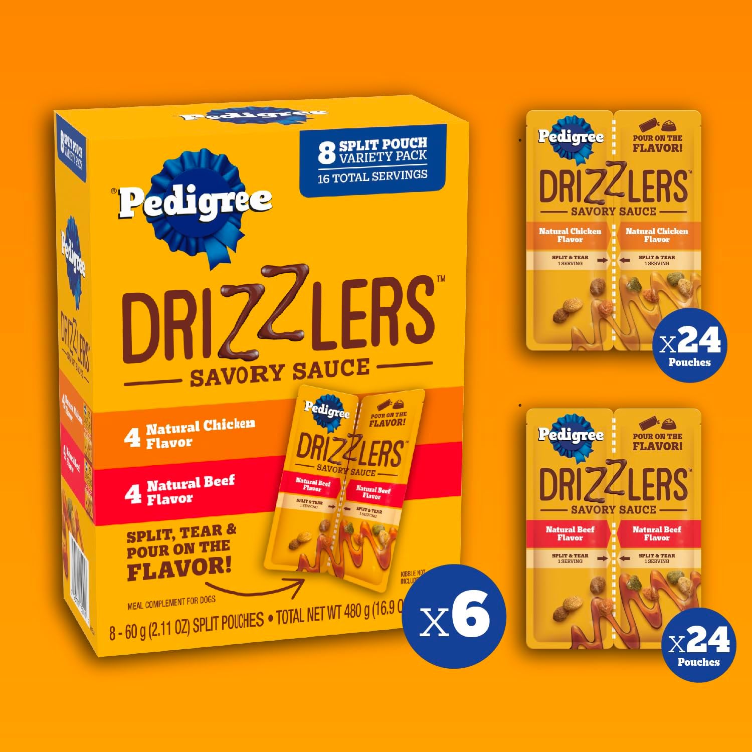 Dogs bring out the good in us. Pedigree brings out the good in them. Pedigree Drizzlers Savory Sauce Pouches, bring delicious flavor to your dog’s favorite kibble, even for the pickiest of eaters. Packed in a unique dual-serving split pouch, this kibble sauce for dogs lets you pour on the flavor now and later. To add flavor to mealtime, split the pouches apart, tear one open, and pour it on your dog’s dry kibble. The savory sauce coats dry kibble so it stays crunchy while adding flavor with only 4 calories per serving. Pedigree Drizzlers Savory Sauce contains only 8 ingredients and is formulated without artificial flavors, high fructose corn syrup, added sugars, and artificial preservatives, although trace amounts may be present due to potential cross-contact during manufacturing. Pour on the flavor and excitement at mealtime with Pedigree Drizzlers Savory Sauce.